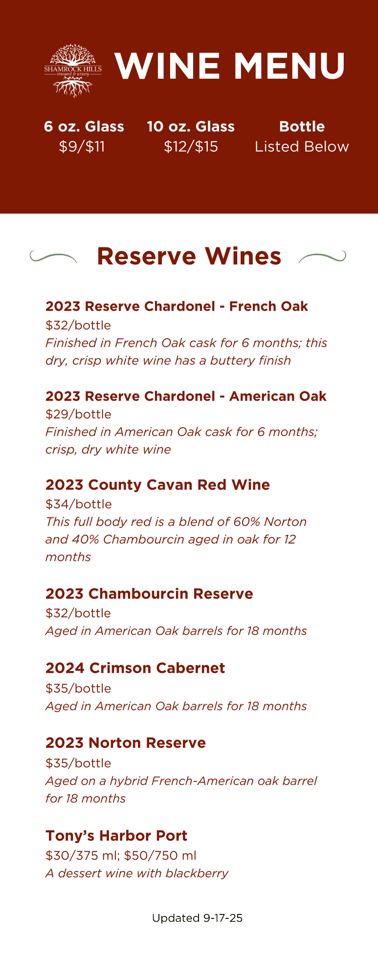 This full-bodied dry red is a 60:40 blend of Norton and Chambourcin. Aged in hybrid oak barrels for 12 months, this wine boasts hints of plum with soft tannins and a light pepper finish.